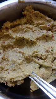 3. Once it cools down, grind both these mixitures little coarsely with salt, asafoetida, jaggery and tamarind paste.
