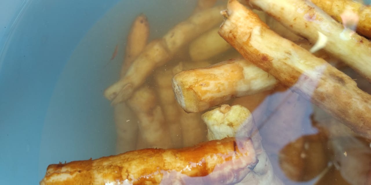 Cut them into little big pieces and put them into a dry vessel. Add turmeric and salt to it, mix well.