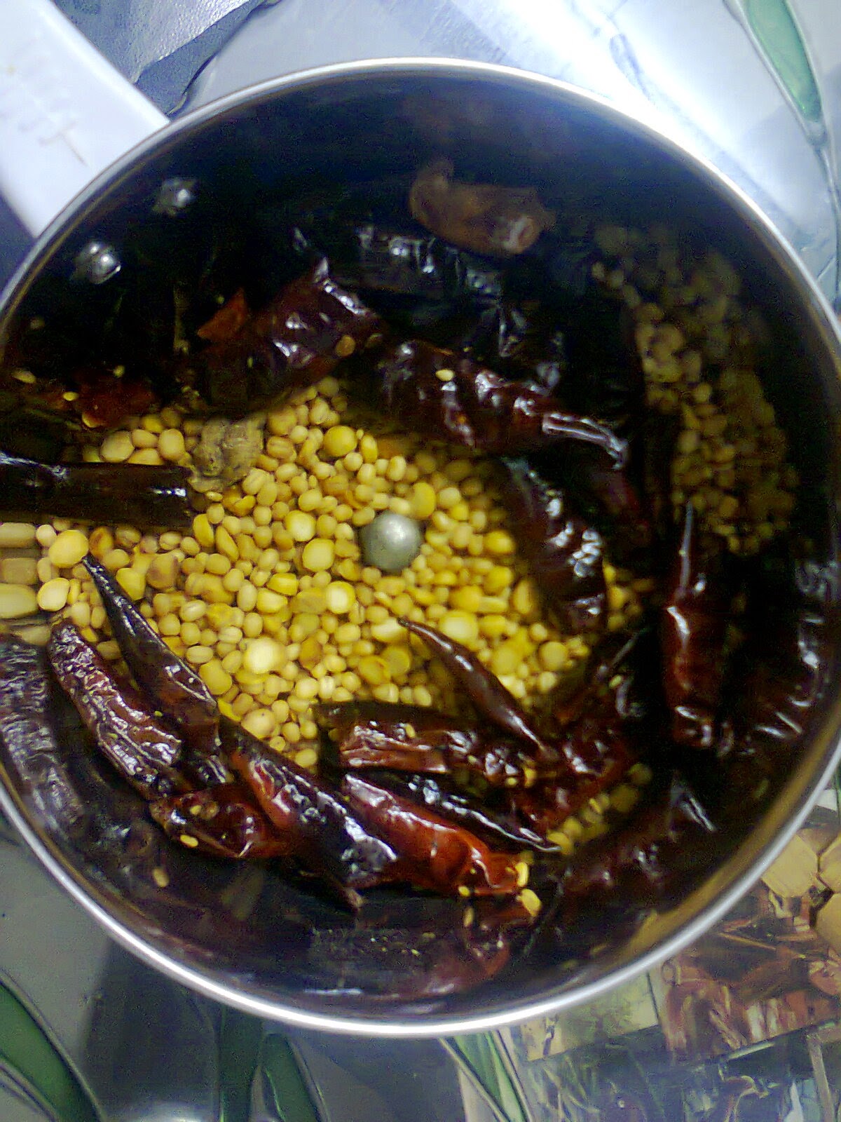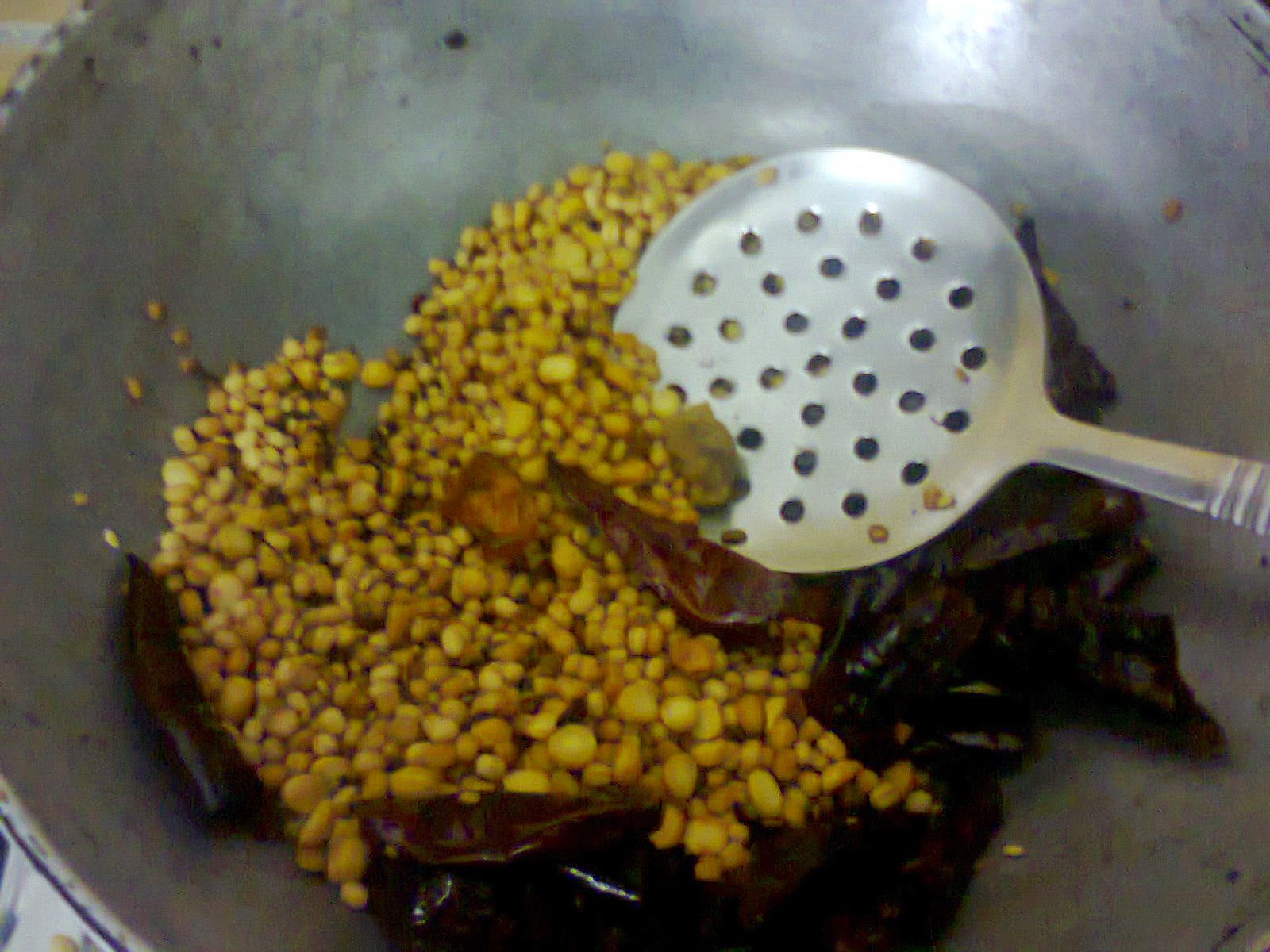 1. Heat a pan and dry saute the pottu kadalai/gram and red chillies till the kadalai/gram becomes well hot and releases all its hidden moisture.