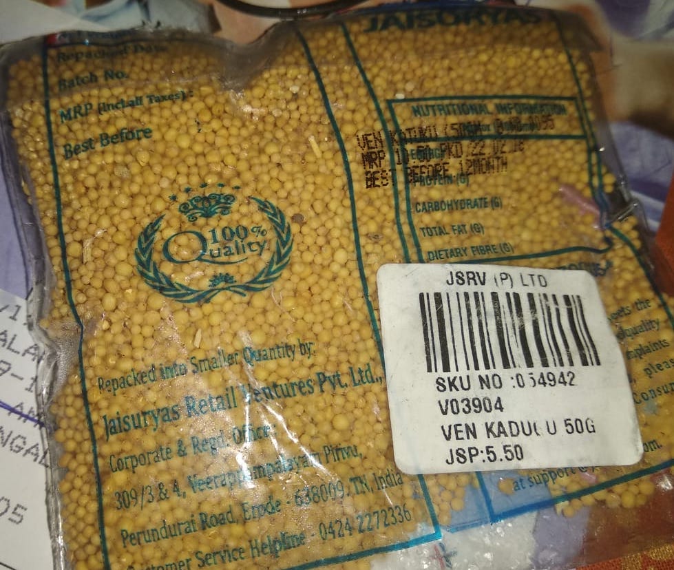 Mustard seeds/Rai/Kadugu : 3/4th tsp